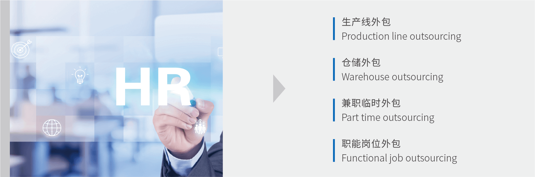 ◎ 專業化的外包服務團隊,通過業務流程標準化,協助企業降低運營成本,規避用工風險,全面提升工作效率